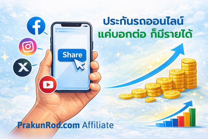 PrakunRod Affiliate เป็นโครงการที่เปิดโอกาสให้ทุกคน สร้างรายได้จากการแนะนำเพื่อนซื้อประกันรถออนไลน์ แค่แชร์ลิงก์ของคุณผ่าน Facebook, IG, LINE, X, Youtube หรือช่องทางที่คุณถนัด